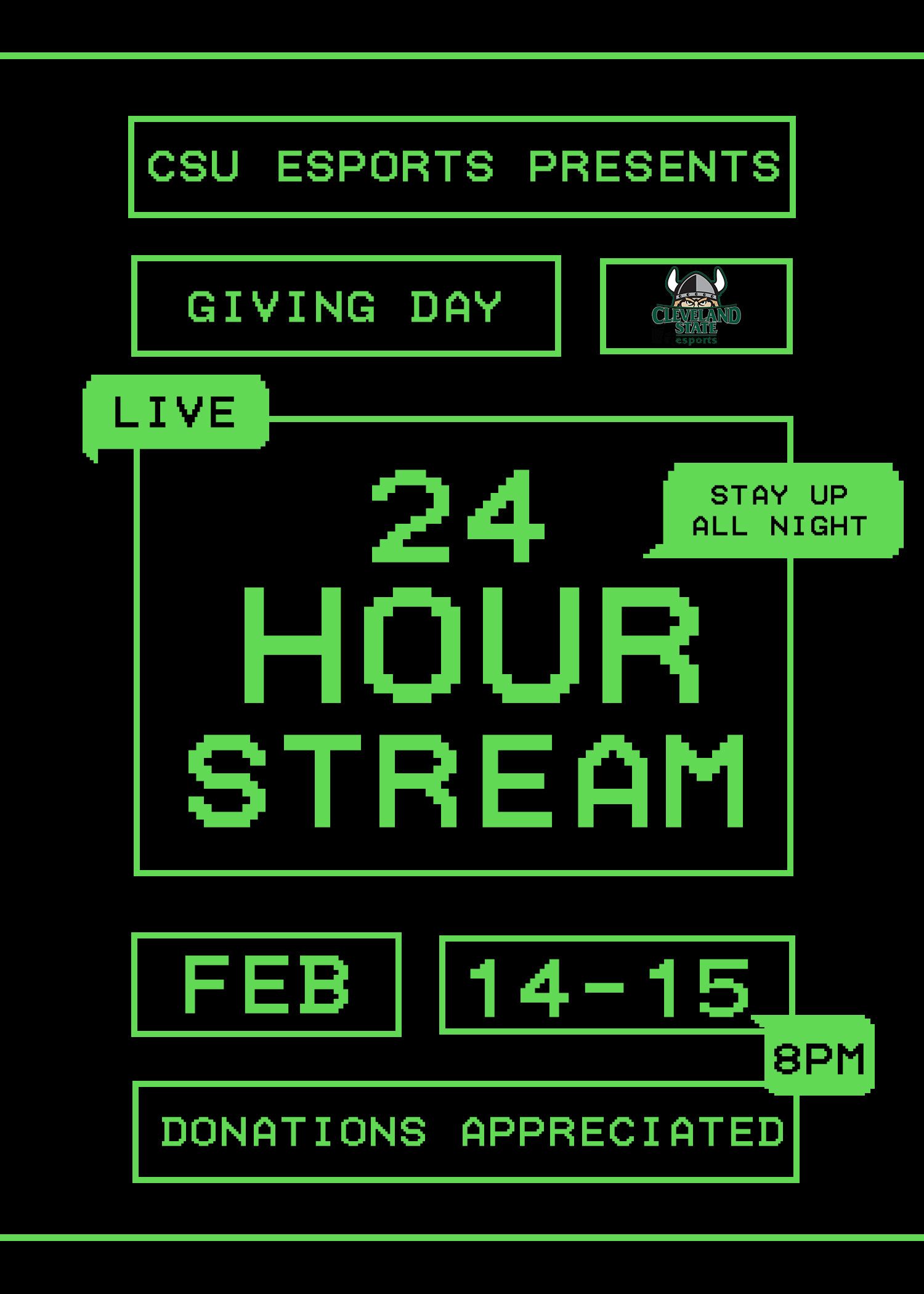 On February 14th at 8 pm, Cleveland State Esports will be hosting our annual 24-hour stream for Giving Day! Be sure to tune in for some great content, sweet donation prizes, and tons of fun with CSU’s Esports team! 💚🎮